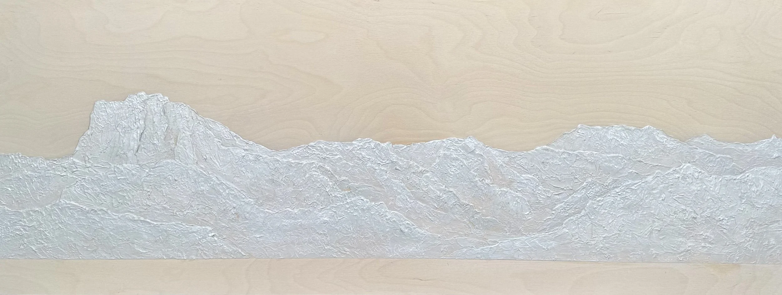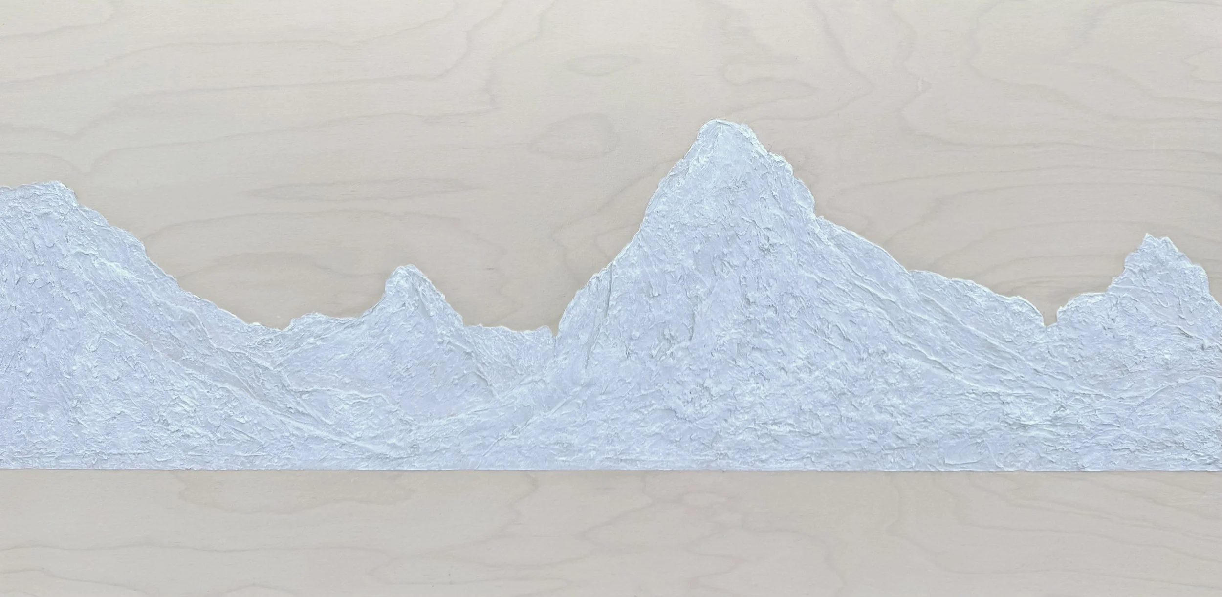 In this first mountain painting in this new body of work, the familiar layers of blue have been stripped away. What remains is texture. That raw and bold exposed rock standing bare on the canvas. No colour to hide behind. Just what’s there, in plain sight.