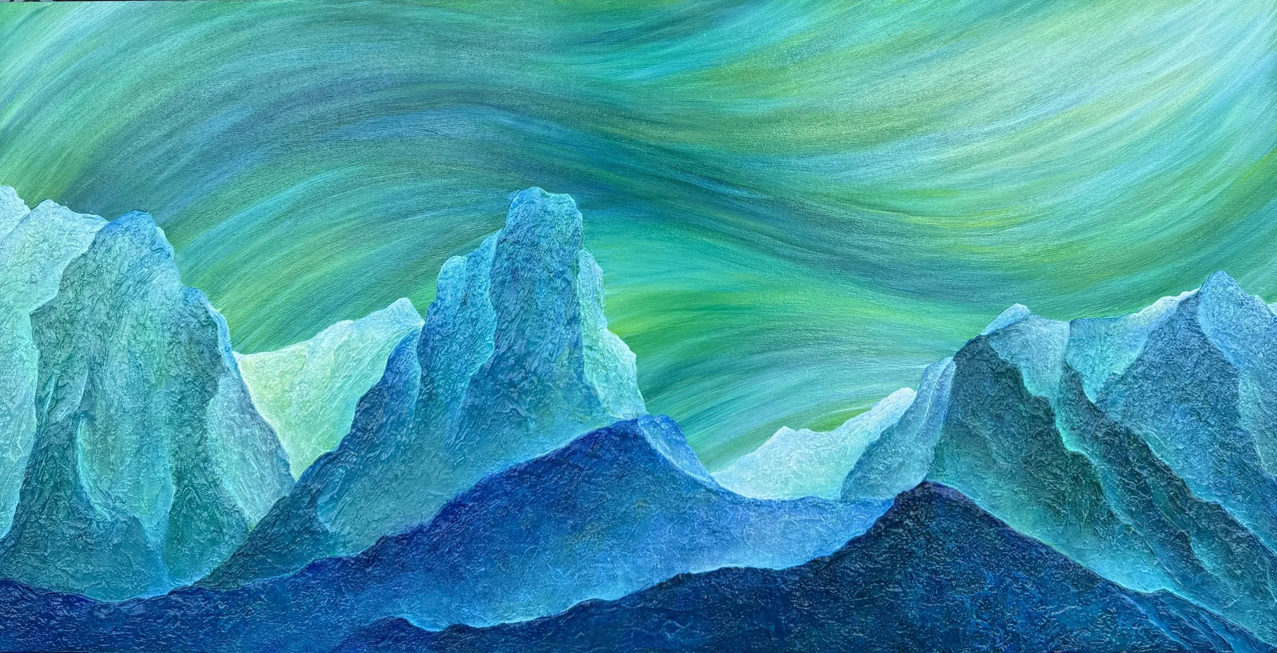 Fisher Peak in all it’s presence brings together textured blues and a sky alive with the glowing light of the Northern Lights—a luminous dance inspired by Van Gogh’s swirling brushstrokes. There’s something about his art that captures the beauty and chaos of inspiration, and I like to think he, too, faced moments of feeling disconnected from his work.